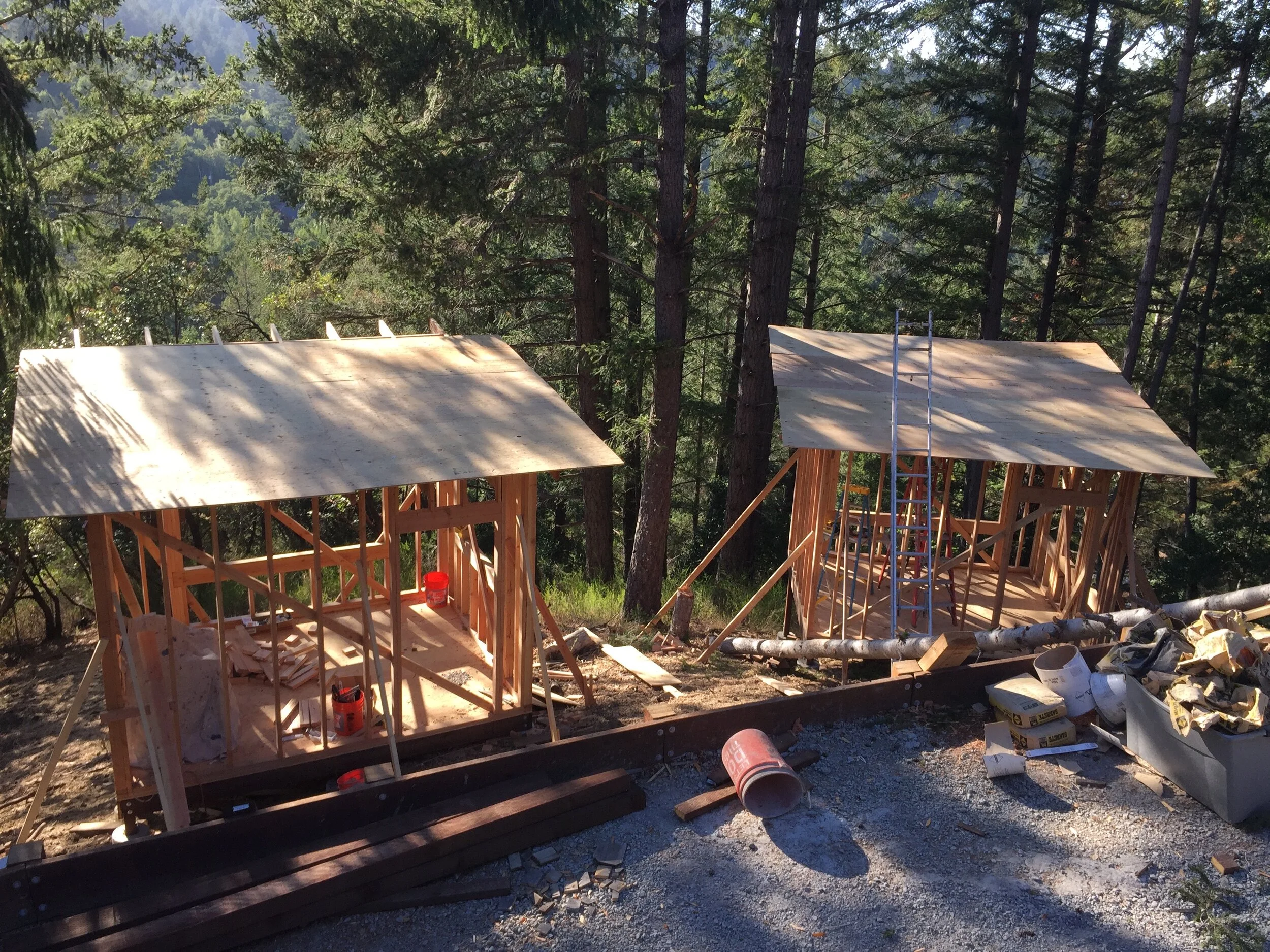 After acquiring an adjacent piece of land at our family home in Northern California, my twin brother and I designed and built two hillside accessory dwelling units (ADUs). This included the design, siting, and overall landscape plan for these units that integrate the new hillside projects with the main property. The plan included a driveway extension, retaining walls, terraces, and planting plans to seamlessly blend the new additions. These units serve as guest bedrooms to the main house and allowed our mother to downsize while still being able to entertain visitors and hold retreats on the property. We’ve named these additions “The Pods.”