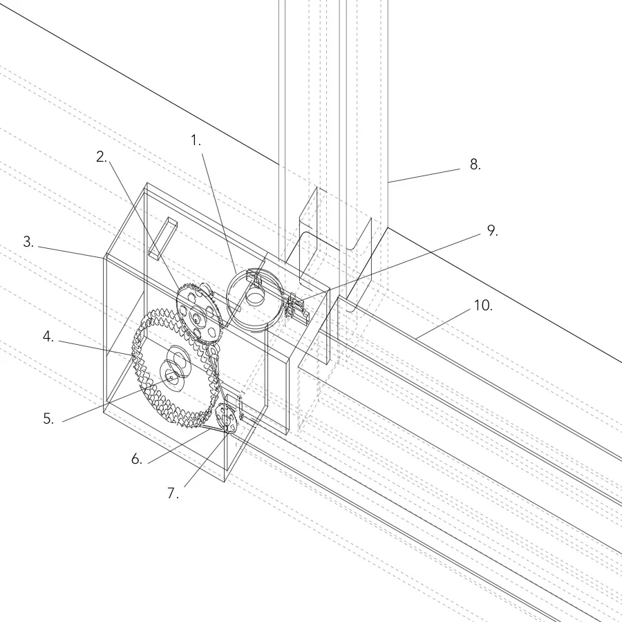 This project amplifies the intertwined themes of mechanical movement and theatrically staged life at Villa Tugendhat by focusing on the physical mobility of an hypothetical Miesian high rise façade. It develops and expands on Mies’s dualistic themes of mechanized and phenomenal experience through the scripting of surfaces to allude depth through flatness, as well as innovative intersections for tech- nology and architecture. Based on the precedent analysis of performance, our final product became a performative apartment unit that was able to be manipulated by the individual occupant. While the mechanics are curated, the action across the facade is entirely dependent on the resident. The field reads as a visual manifestation of collective freedom of choice, an architectural representation of indi- viduality. Each has the ability to manipulate a single moving module as part of a unit of three, arranged diagonally such that each has vertical autonomy and no two units interrupt one another. This allows for random arrangements and organizations across the facade which are compounded by the less obvi- ously regular grid. The variation in opacity of the overhang creates moments of light, color, and shadow across the face, which mingle with the extrusions and scaffold. The result is a kinetic scripted façade which provokes new possibilities and varied arrangements. Its various overlaps of literal and phenomenal transparency, reflectivity and color implicate the module and the field, part and whole. Difference is teased out of repetition- sometimes in unison and sometimes out of step. The changes in color change with day, temperature, breeze, and simply personal preference, and allow the field to perform as an ecosystemic exhibition of everyday life. Project completed in cooperation with Clarrisa Brunt and Macaela Danko.