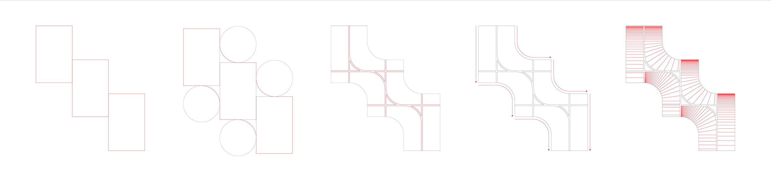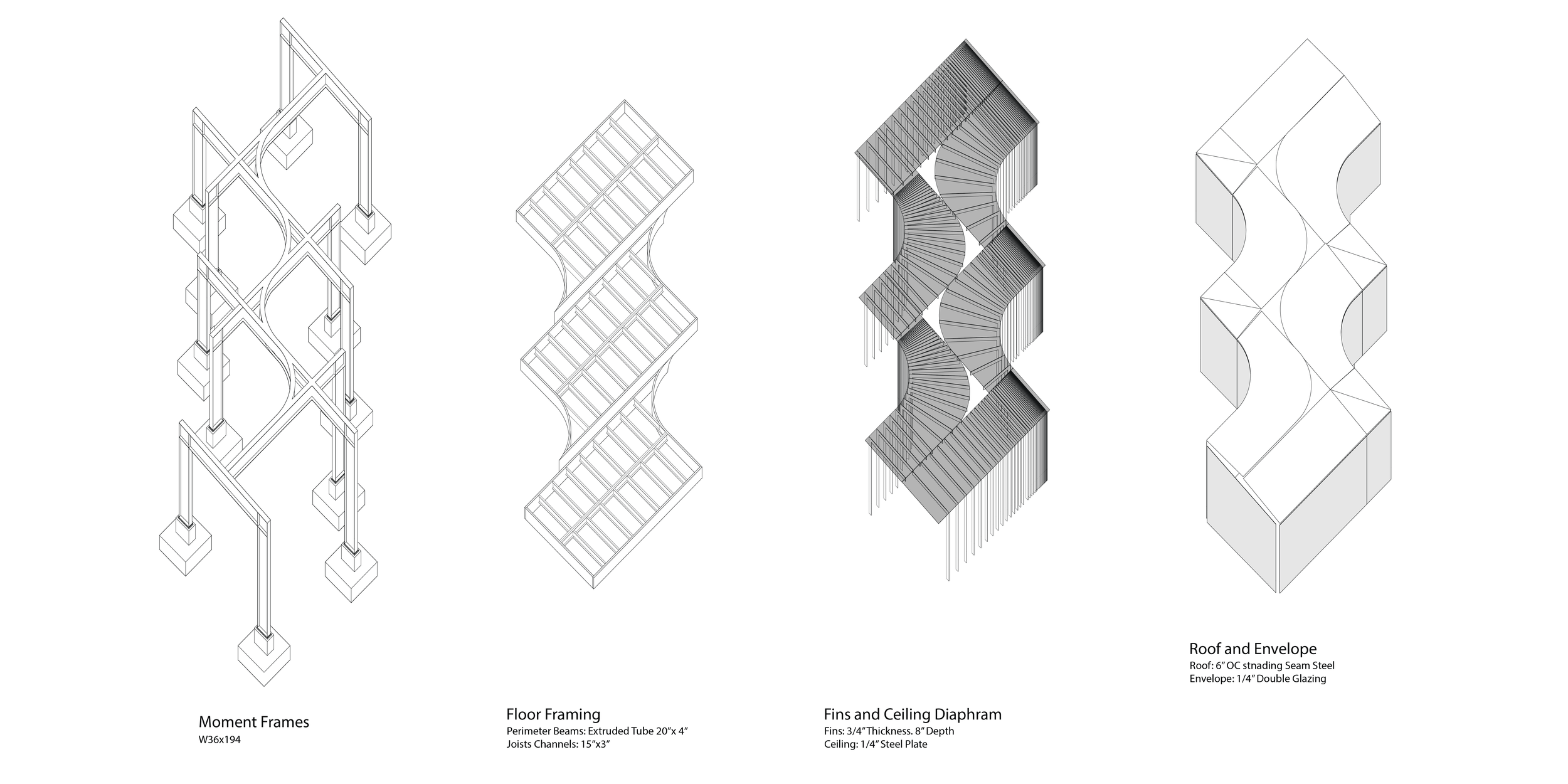 In order to maintain the clear spans of glazing, single roofline, and fin structure, the project relieson several steel details that allow the drainage and functional structure to be hidden. To cap each span the project uses a gutter system that allows rain to drain away from the glazing and down the edges of the moment frame without ever exposing the system from the exterior (top left). At each moment frame, a custom fin drains the water down to the ground without the need for a secondary downspout (bottom right). In order to maintain the full effect of the secondary structure, both the glazing and fins run past the level of the floor to allow a more subtle interaction between the shadows of the fins and the shadows of the trees (bottom left). At each moment where the momentframes interact, skylights allow this gap in structure to be exploited (top right).