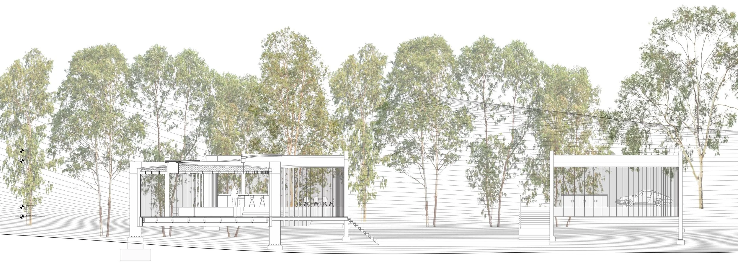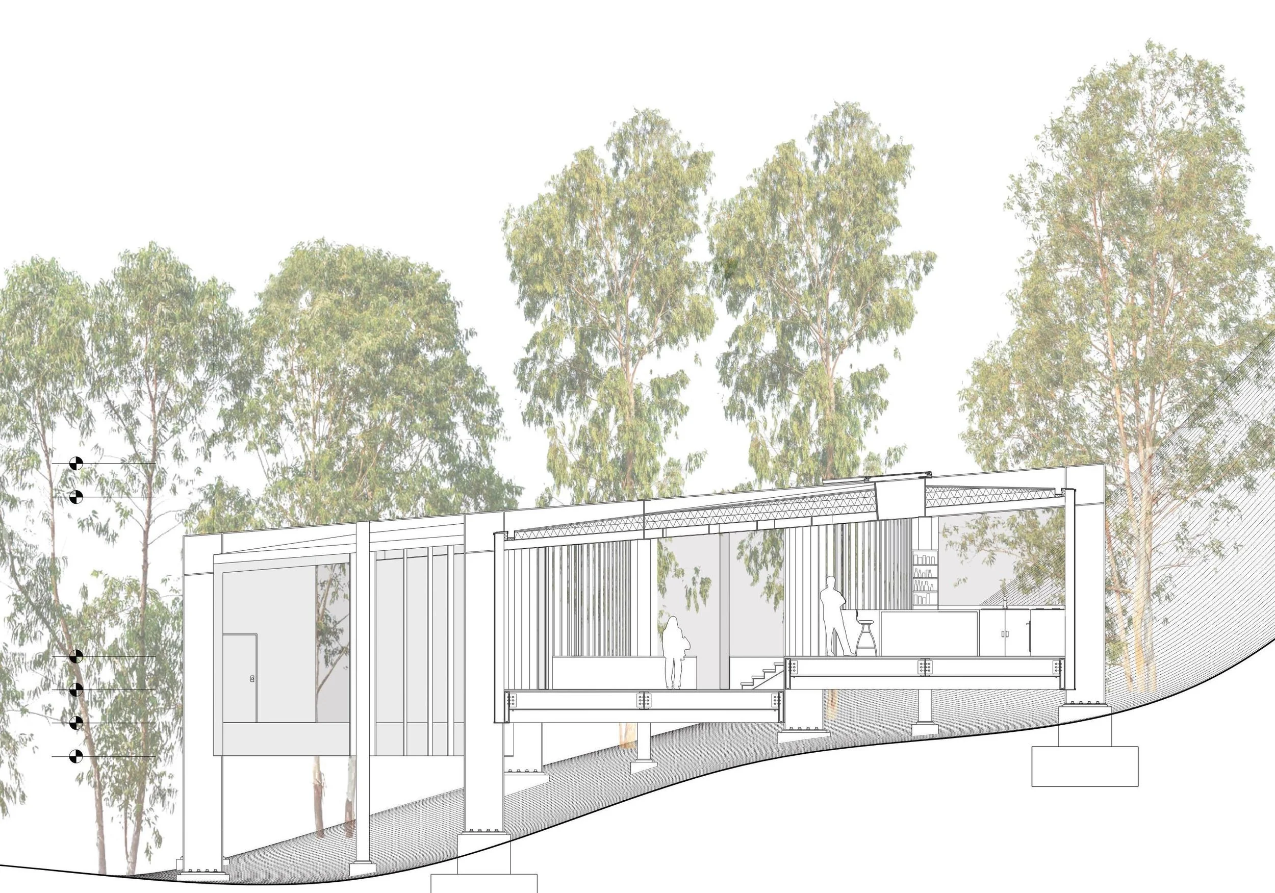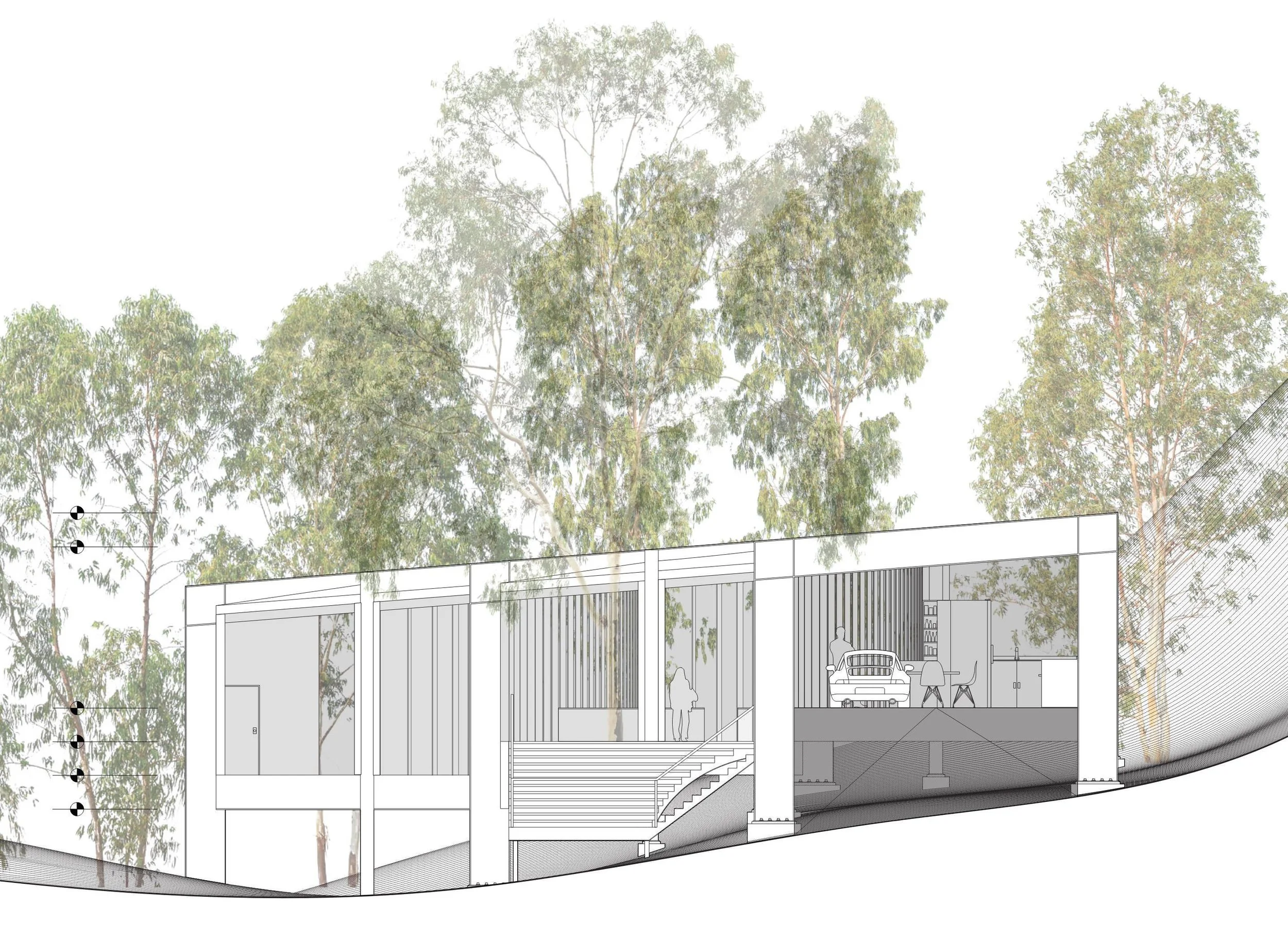 This project draws inspiration from its site in the eucalyptus groves above Malibu, CA to nestle a home and exhibition space into the hillside of Southern California. The guiding principle in siting this project is the idea of minimal impact on the surrounding landscape. By using three main masses stepped down the hillside the house is able to create a low profile that follows the slope of the hill and avoids existing trees. The driveway, garage, and entry path are all guided to respond in a similar way, and remain consistent with the geometry of the project.